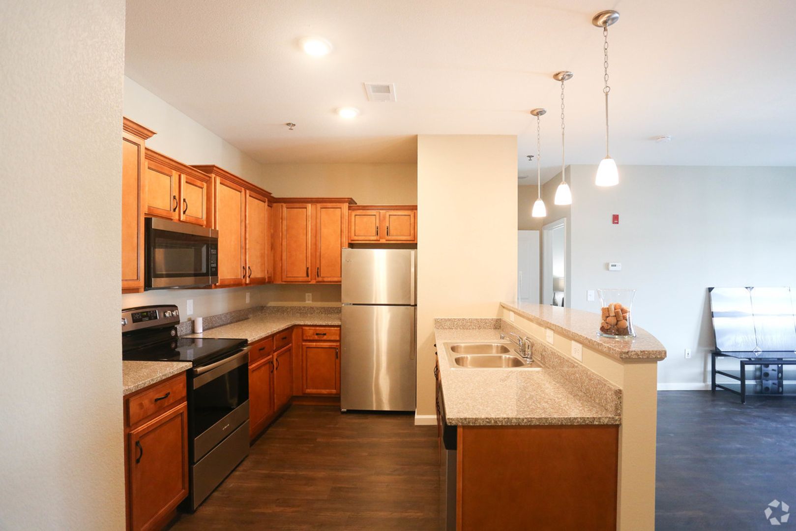 Luxury features include spacious floor plans with open flow of kitchen, dining and living areas. Gourmet kitchens boast granite countertops, abundant kitchen cabinet space, upgraded cabinets, faux hardwood flooring, spacious bedrooms with ceiling fans and enormous closets. Designer baths offer adult high vanities, and every apartment home comes with in unit washer/dryer.